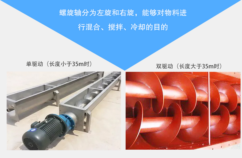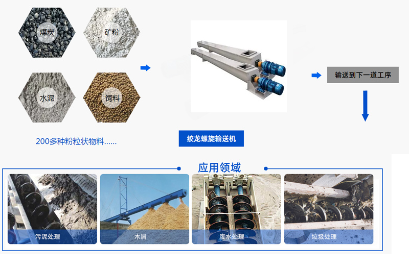 絞龍螺旋輸送機通常水平或略微傾斜使用,作為輸送半固體材料的有效方式(shì),包括飼料、糧食、麵粉、玉米、大豆、垃圾、木屑、骨料、汙泥、固體廢物等,每小時輸送量在1.4-458立(lì)方米(mǐ),輸送長度(dù)可(kě)達70米。