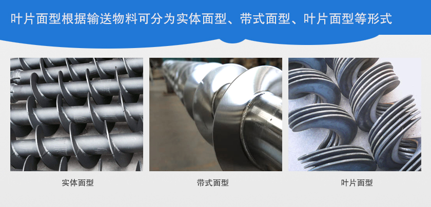 絞龍螺(luó)旋輸送機旋轉軸(zhóu)上(shàng)焊有螺旋(xuán)葉片,葉片麵型根據輸送物料(liào)可分為實體麵(miàn)型、帶式麵(miàn)型、葉片麵型等形式。