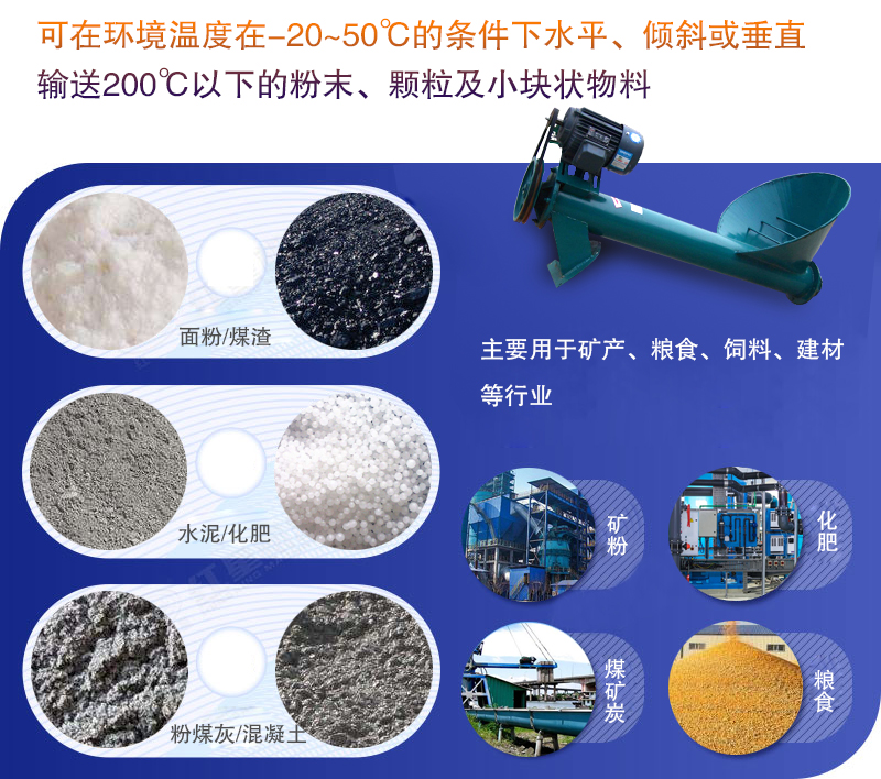螺旋(xuán)給料機主要用於礦產、糧(liáng)食、飼料、建材等行業,可在環境溫度在-20~50℃的條件下水平、傾(qīng)斜或垂直輸送200℃以(yǐ)下的粉末、顆粒及(jí)小塊狀物料,如:麵粉(fěn)、煤渣、粉(fěn)煤灰、化肥、水泥(ní)、混凝(níng)土等物料。