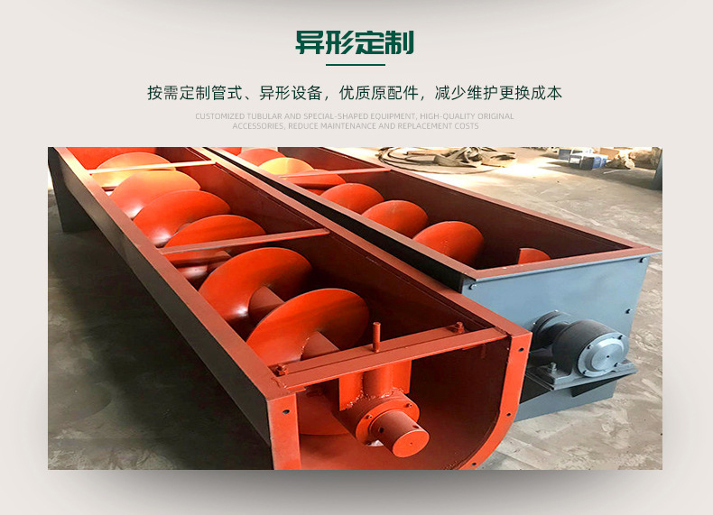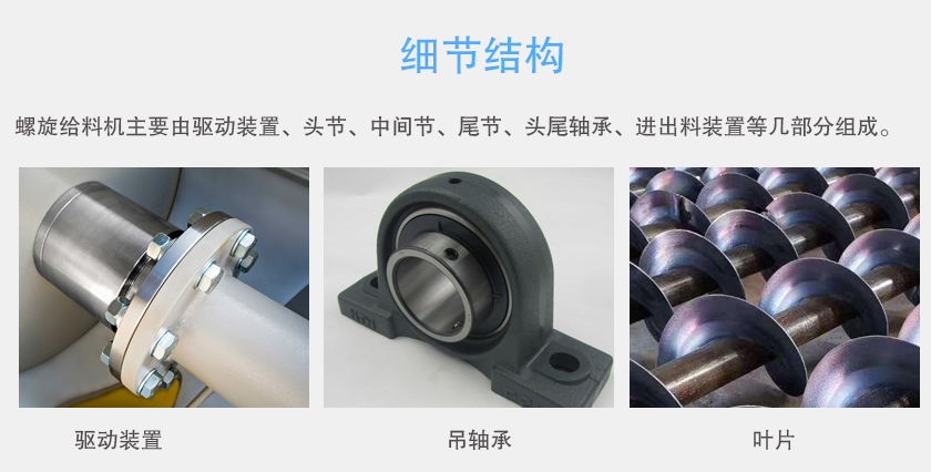 螺旋給料機主要由驅動裝置、頭節、中間節、尾節、頭尾軸承、進出料裝(zhuāng)置等幾部分(fèn)組成。